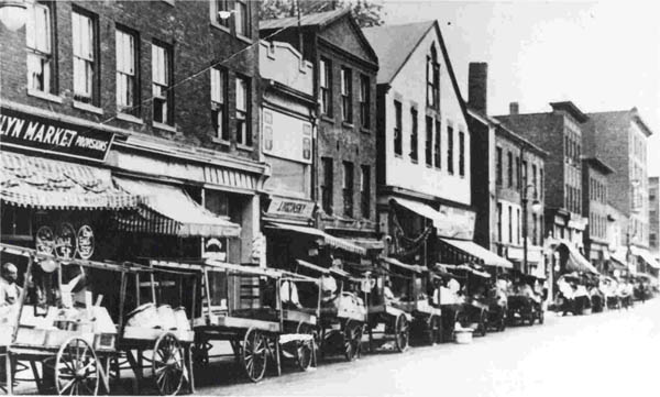 Pushcarts lined up on Front Street in Hartford, circa 1920.