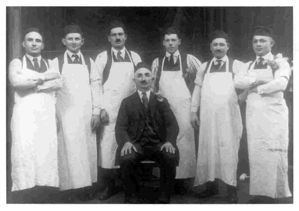 Hartford Kosher Butchers' Association, ca. 1919. Standing from left: Hyman Beck, David Matts, Zadyl Kavitsky, Morris Leibert, Jake Brenner, Sam Smith (the founder of Crown Market), and (seated) Meyer Darefsky.